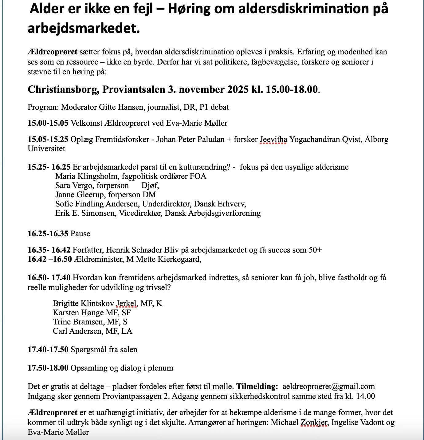 Den 3. november 2025 afholdt Ældreoprøret en høring på Christiansborg.Forskere, fagbevægelse, seniorer, politikere, ældreministeren og deltagere i salen diskuterede, hvordan vi kan bekæmpe diskrimination af ældre på arbejdsmarkedet. Det er svært som fyret 55+ at få nyt arbejde og hver fjerde folkepensionist fortryder at være gået på pension.
